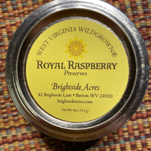 Wildgrown red raspberry is the essence of summer in concentrated form. This rich ruby delight combines our garden raspberries with beach plums, which add an undercurrent of tartness to the sweet berries. Served at the breakfast table, as an exceptional accompaniment to cheeses, ham, poultry and salmon, or as a savory dessert topping, Royal Raspberry Preserves is a gourmet fruit treat certain to please people of all ages. No pectin added. Lower in sugar than most commercial offerings.