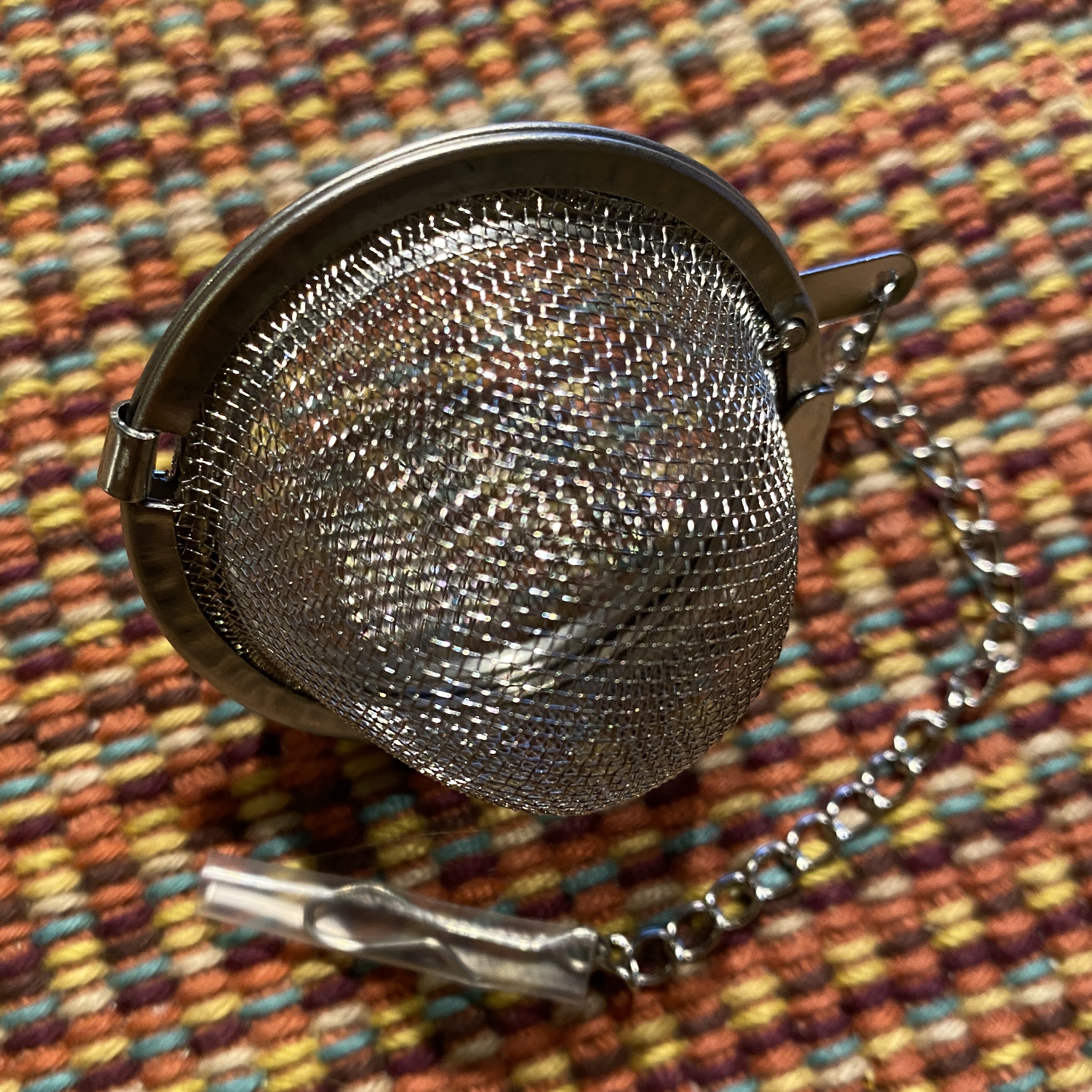 This stainless steel mesh tea strainer is perfect for steeping a teaspoon at a time of your loose leaf tea. Comes attached to a chain for hooking the strainer to the rim of a mug or teapot. Packaged in compostable cello sleeve.